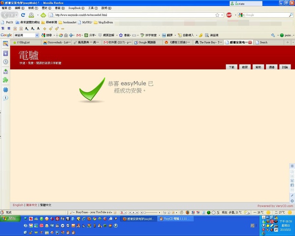 我只好到偉大的VeryCD註冊,並開始養動物,真是個溫馨的website,註冊成功的註冊信都寫上「歡迎你」這等誠懇的詞語,真窩心。安裝也是簡單的靠北邊走,也會恭喜你安裝成功,如首圖。摸索了一陣子,下了《鏢客三部曲1:荒野大鏢客》(A Fistful of Dollars )意英雙語+導評/原創[DVDRip]。不過實際使用後發現速度不快,果然是隻驢,不過可能是我本身的網路速度就不快了,我記得我申請的好像是1M,256K。